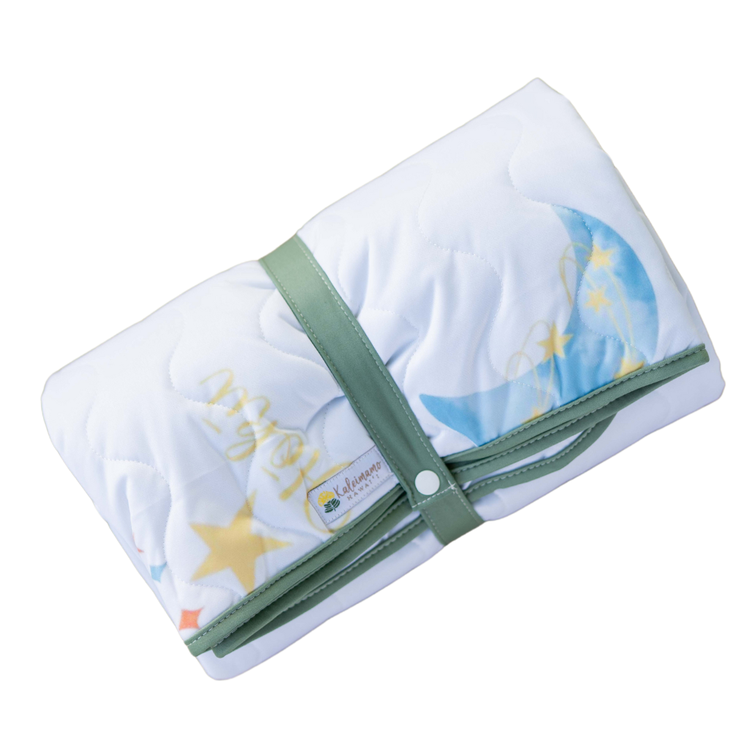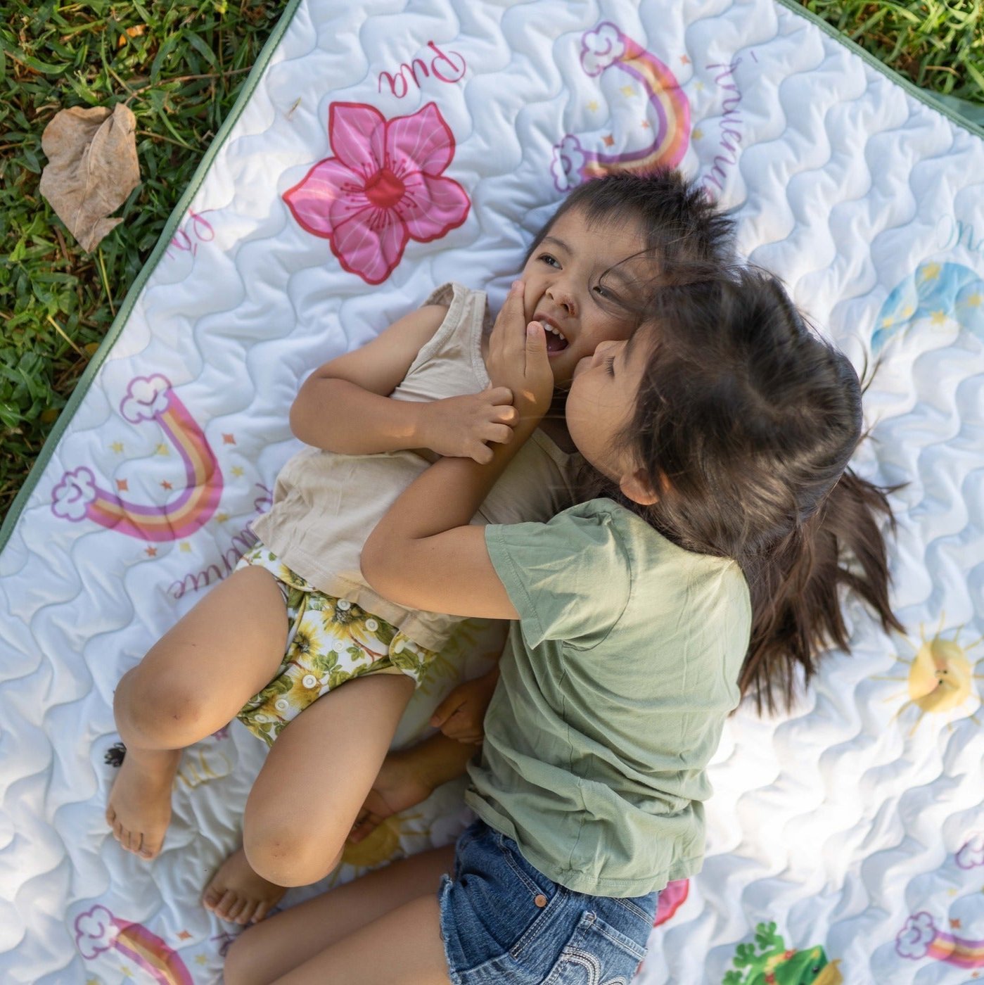 Our Moena Pāʻani are perfect for a day at the park or beach, naps, or mealtime. While light padding creates a comfortable place to sit and play while out and about, the water resistant exterior helps keep it clean for regular usage. If your mat does get dirty, no problem! Just toss it in the wash and it will be ready to go again in no time. Between all the fun, the snap handle makes for compact, convenient storage in your car, stroller, or wherever else it's needed.