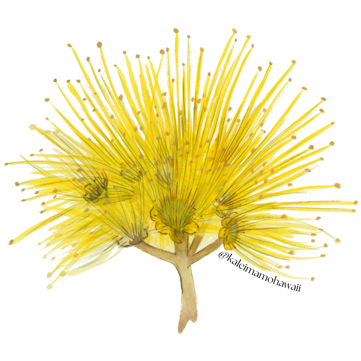 Our signature print, Lehua Mamo, features the yellow flower of the ‘ōhi‘a lehua tree. ʻŌhiʻa lehua is endemic to Hawai‘i and refers to both the tree and its flower. ʻŌhiʻa is one of the first plants to grow when new land is formed, helping to create livable habitats for other species to flourish. A favorite flower referenced in many of our mele (songs), the lehua is often compared to a beloved sweetheart, cherished friend, or treasured family member. While most ʻōhiʻa have red blossoms, the lehua mamo variety is highly valued because of its rarity, and is used by Native Hawaiians in lei and other cultural practices.