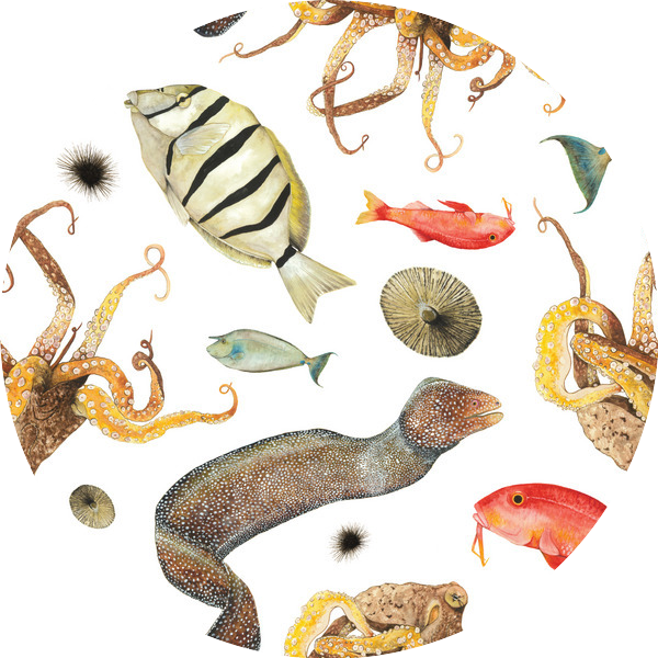 In the early 1980s, the ʻAha Pūnana Leo preschool system was created to save ʻōlelo Hawaiʻi (Hawaiian language) by nurturing a new generation of native speakers. Several children’s songs were composed for the school, including, “Nā Iʻa ʻOno Ē.” This mele speaks of the delectable sea creatures that Native Hawaiians gather for food. With the blessing from the mele’s composers, we showcase the delicacies of the sea in this print: manini, ʻopihi, kala, wana, puhi, weke, and heʻe! These species are commonly found in Hawaiʻi’s tidal and nearshore waters.