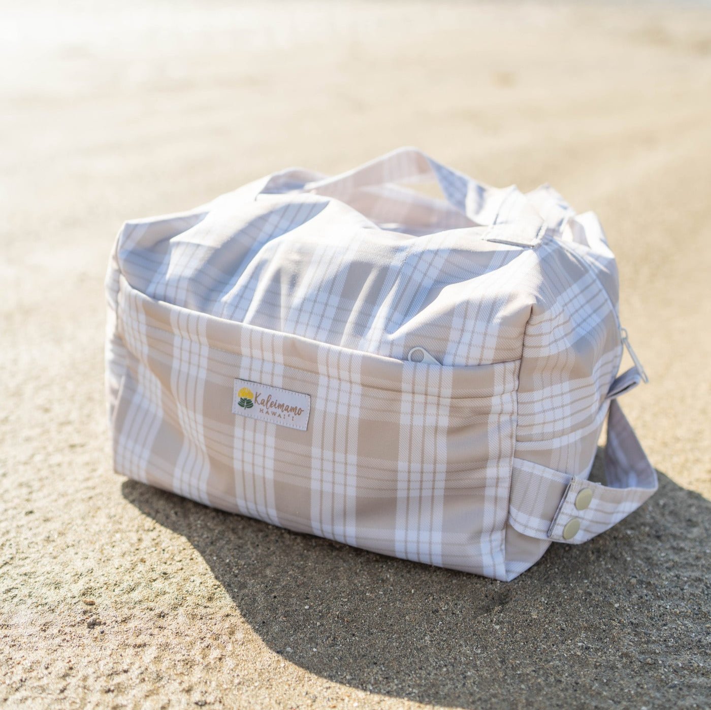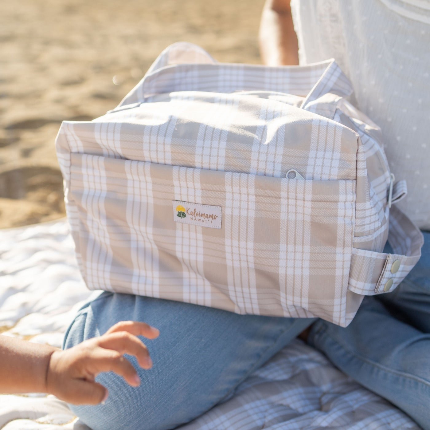 Our pod is incredibly versatile and is truly made for all of your needs! Made of double-layer water resistant material, our pod is perfect to pack a day's worth of cloth diapers for daycare or the grandparents' hale (house). It can also be used as an overnight bag, a beach bag for swimwear and snacks, and a toiletry bag too!