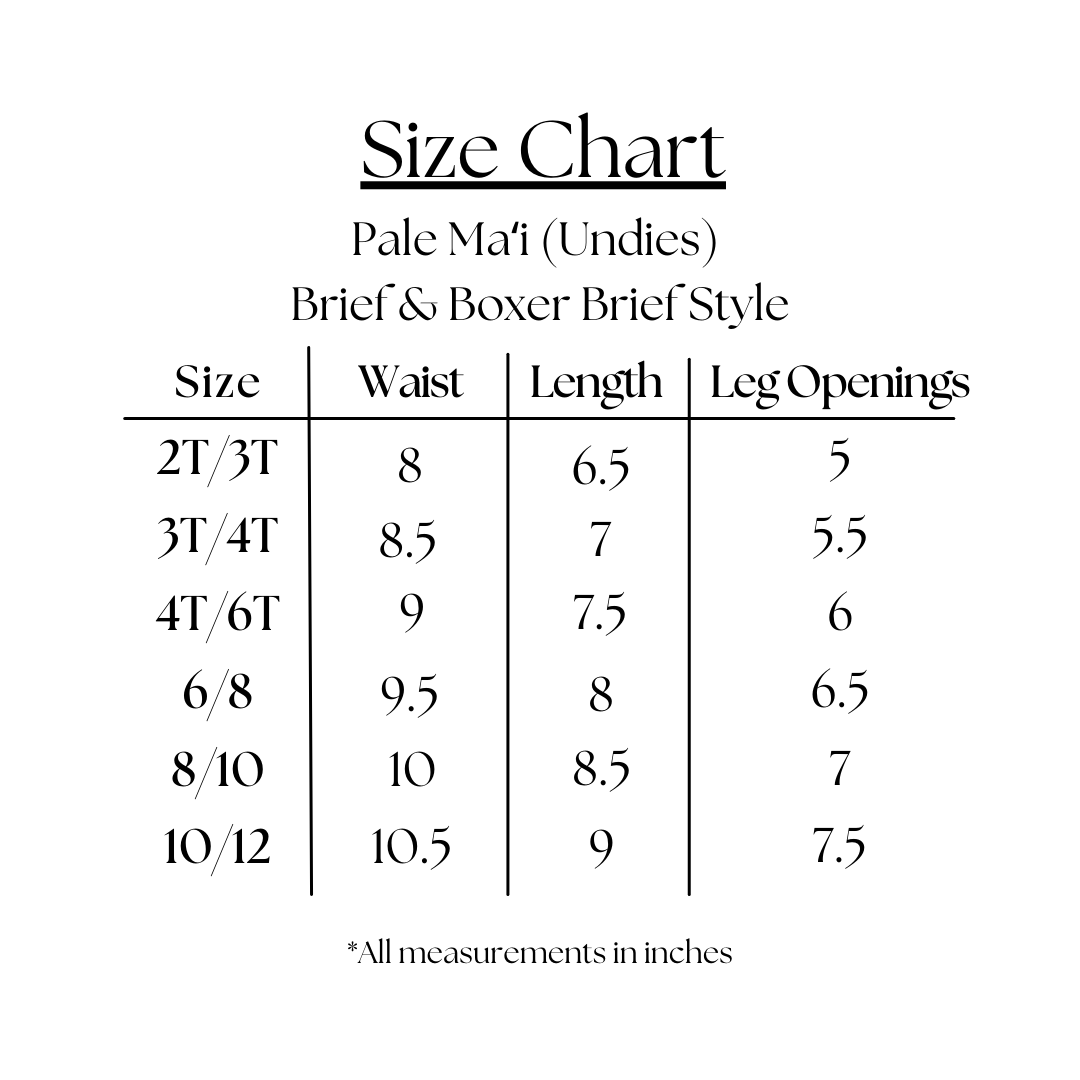 Our unisex Pale Maʻi or Undies are made of super soft, breathable bamboo viscose and spandex. They are cool, durable, and easy for keiki to move in and take on and off to support their budding independence. These undies are the perfect for next step for your keiki after they move on from kaiapa (diapers)!